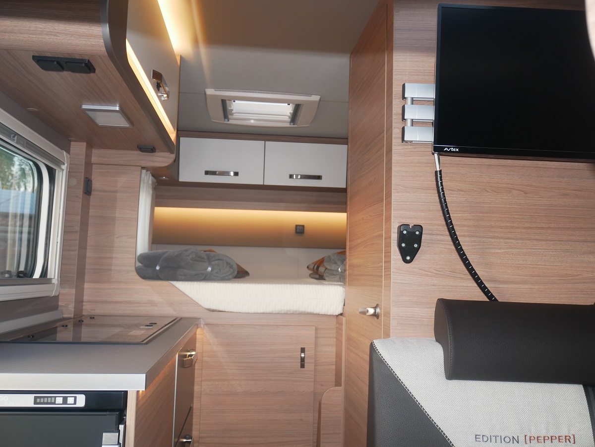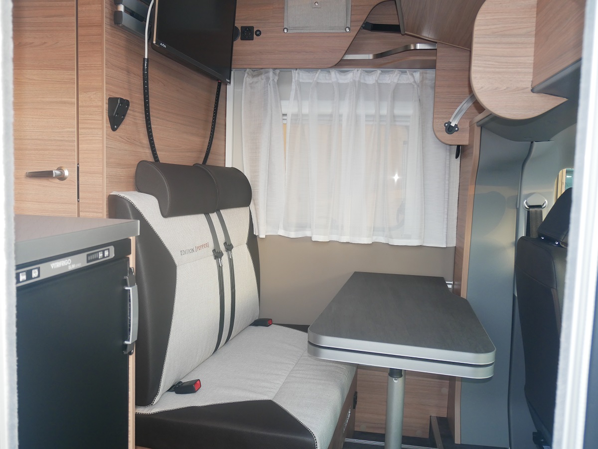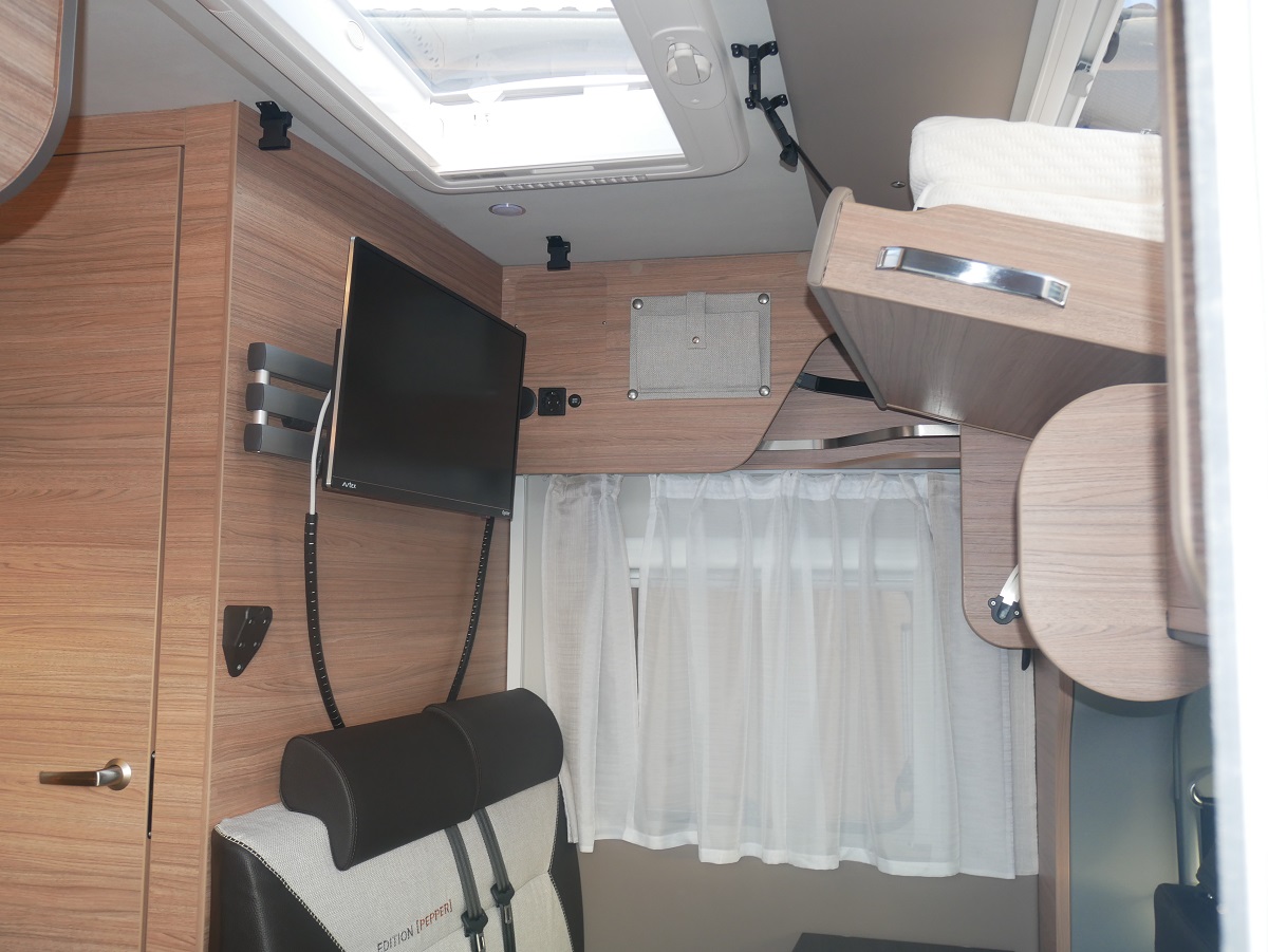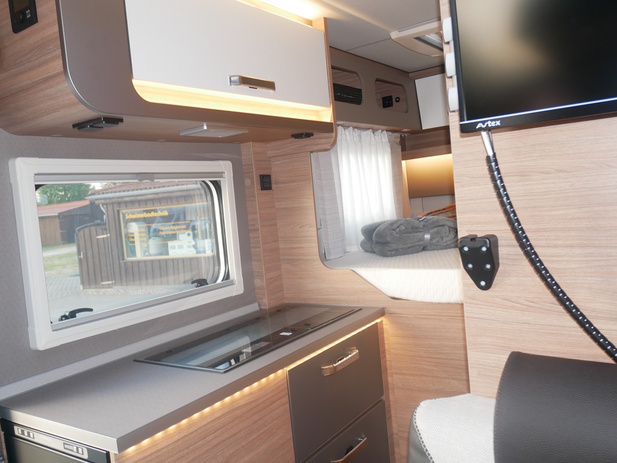 Ausstellfenster Hutze mit Insektenschutz und Verdunkelung, Dachhaube 700x500 mit Kombirollos, Schonbezüge Fahrerhaussitze in Polsterfarbe, Fronstoßfänger in Wagenfarbe, Stauraumklappen beidseitig, Fliegenschutztür, Ausstellfenster mit Kombirollos, Ambientebeleuchtung, Multifunktionslenkrad, Wasserfiltersystem