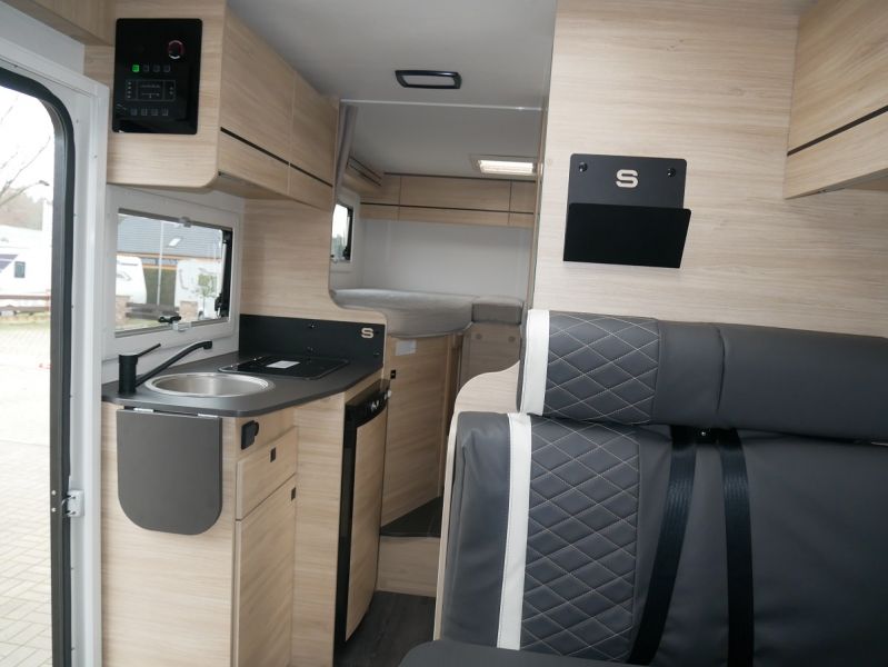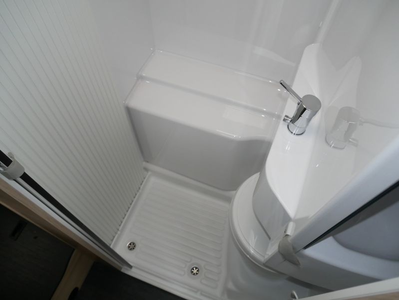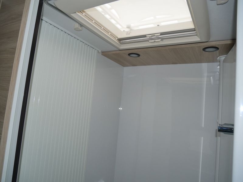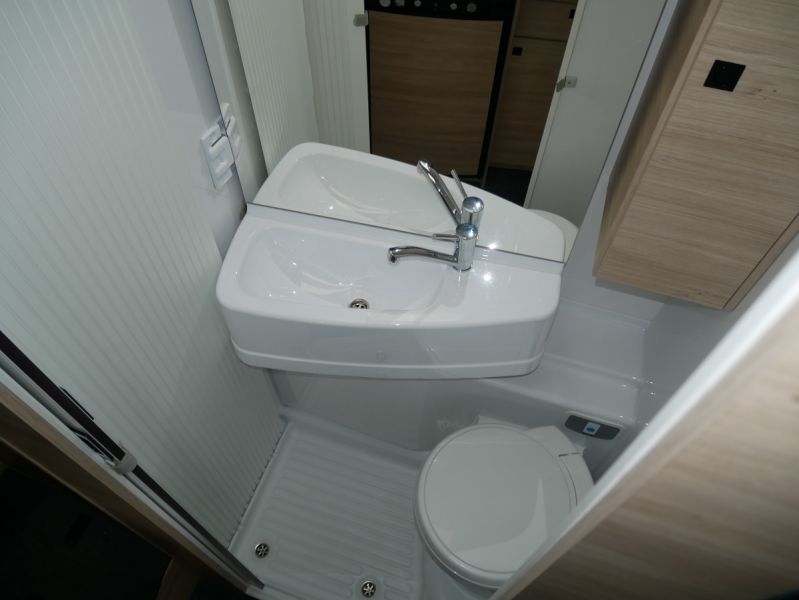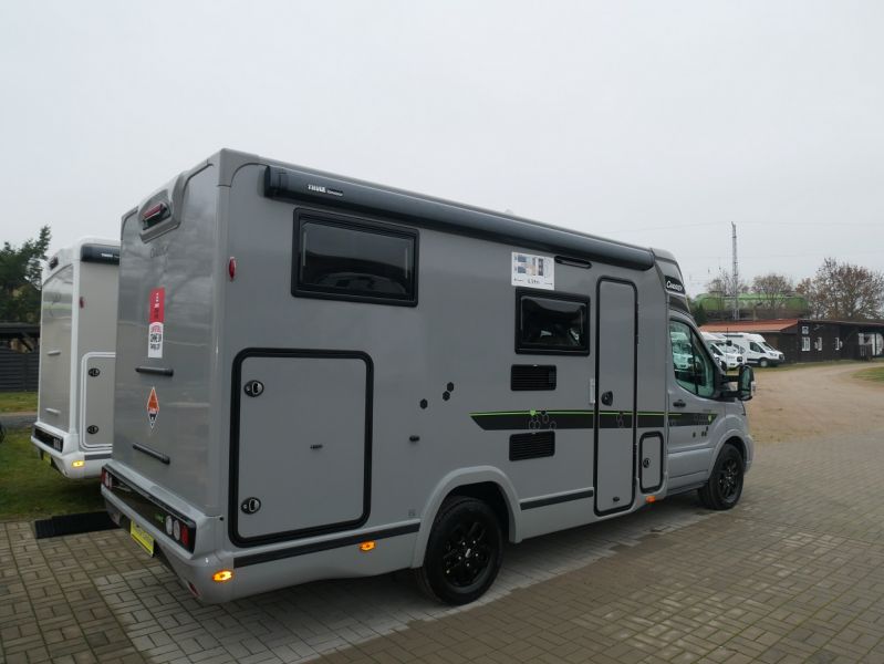 GfK Polyester Dach und Wände + Boden, LED Außenleuchte, Fliegenschutztür, Fenster mit Kombirollos, Technikbox, Gaskochherd, Kühlschrank, Kraftstoffheizung auch während der Fahrt, elektr. Thetford-Toilette, Funktionsdusche, Betterweiterung, Heckgarage mit Stauraumklappen beidseitig,