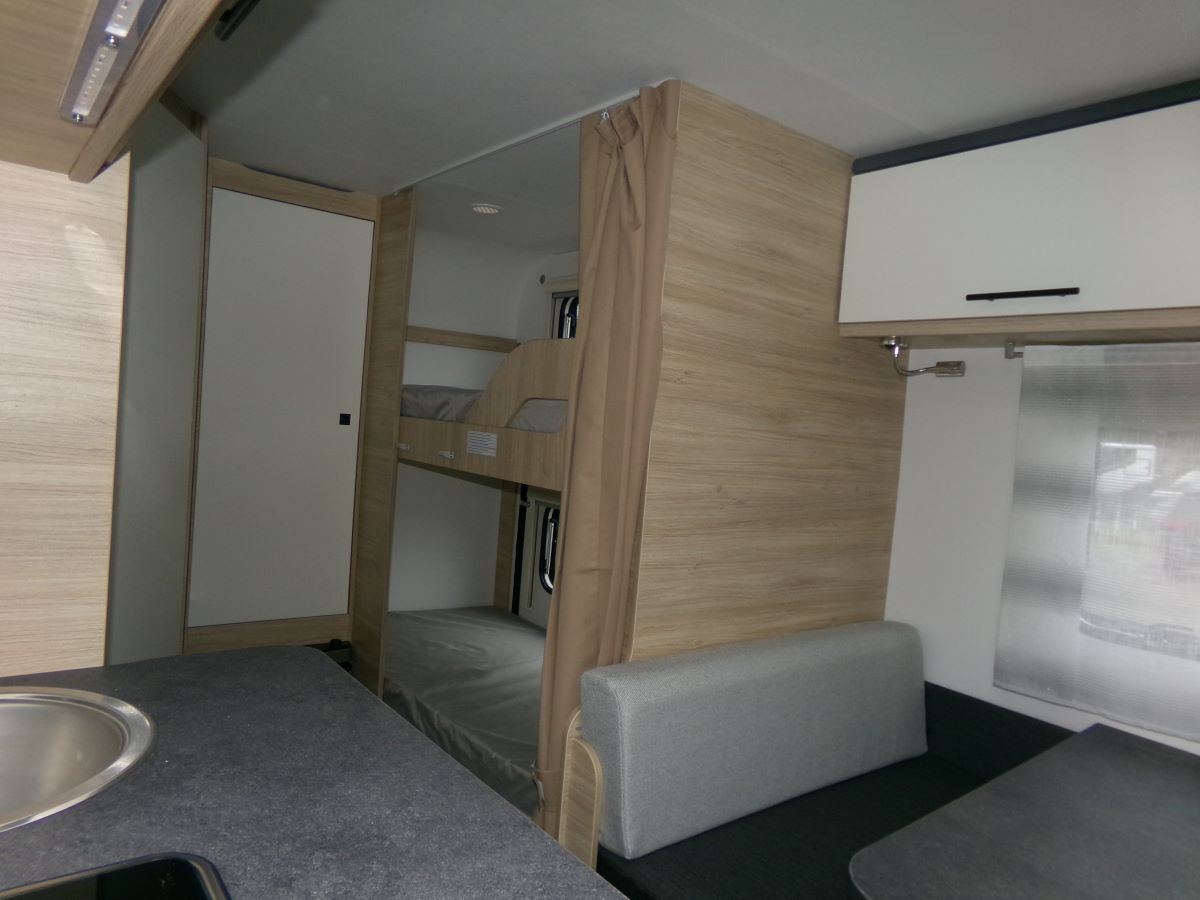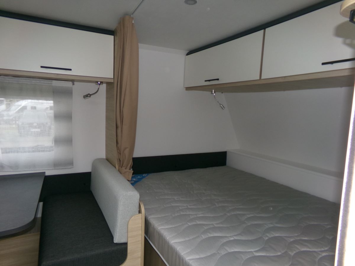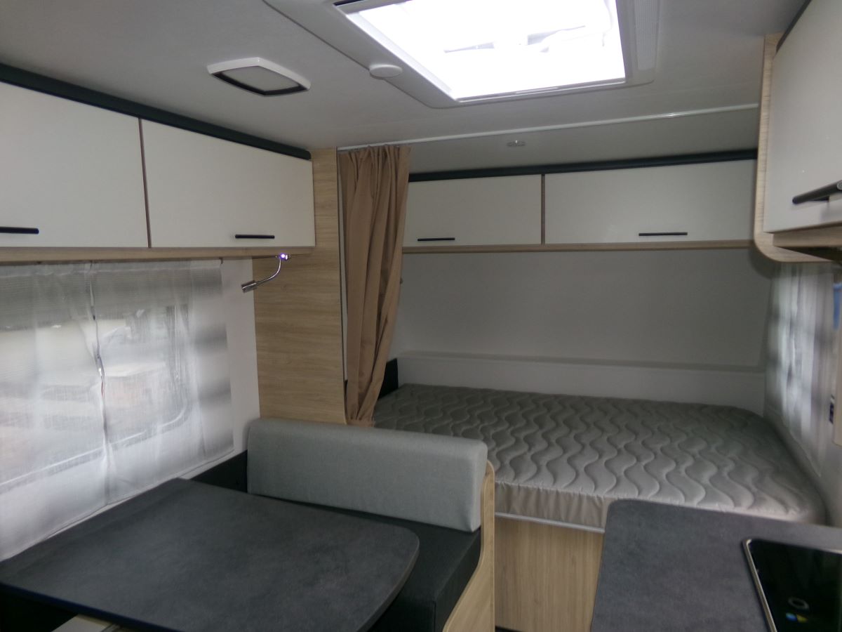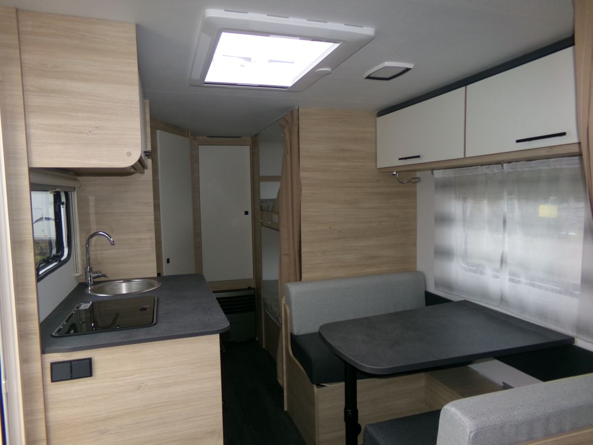 GFK Polyester Dach und Wände, Ausstellfenster mit Kombirollos, 2 flammen Gaskochherd Kühlschrank XL-Freeze 150 l,