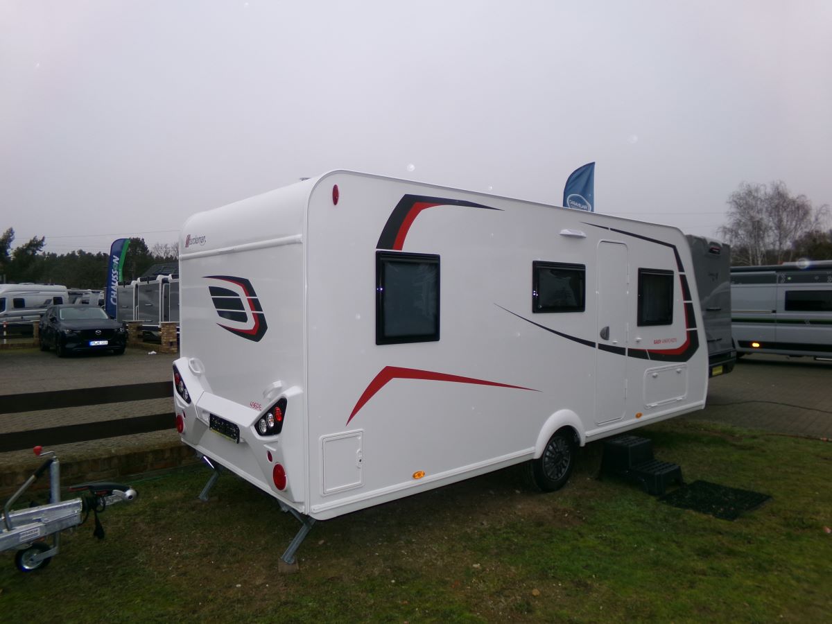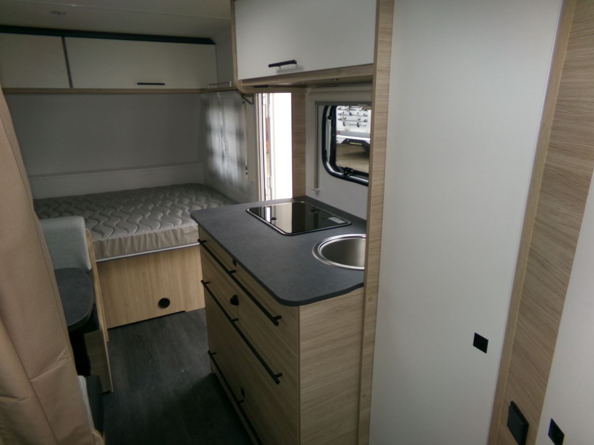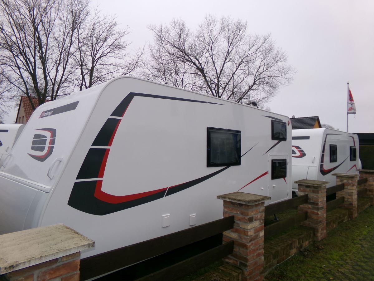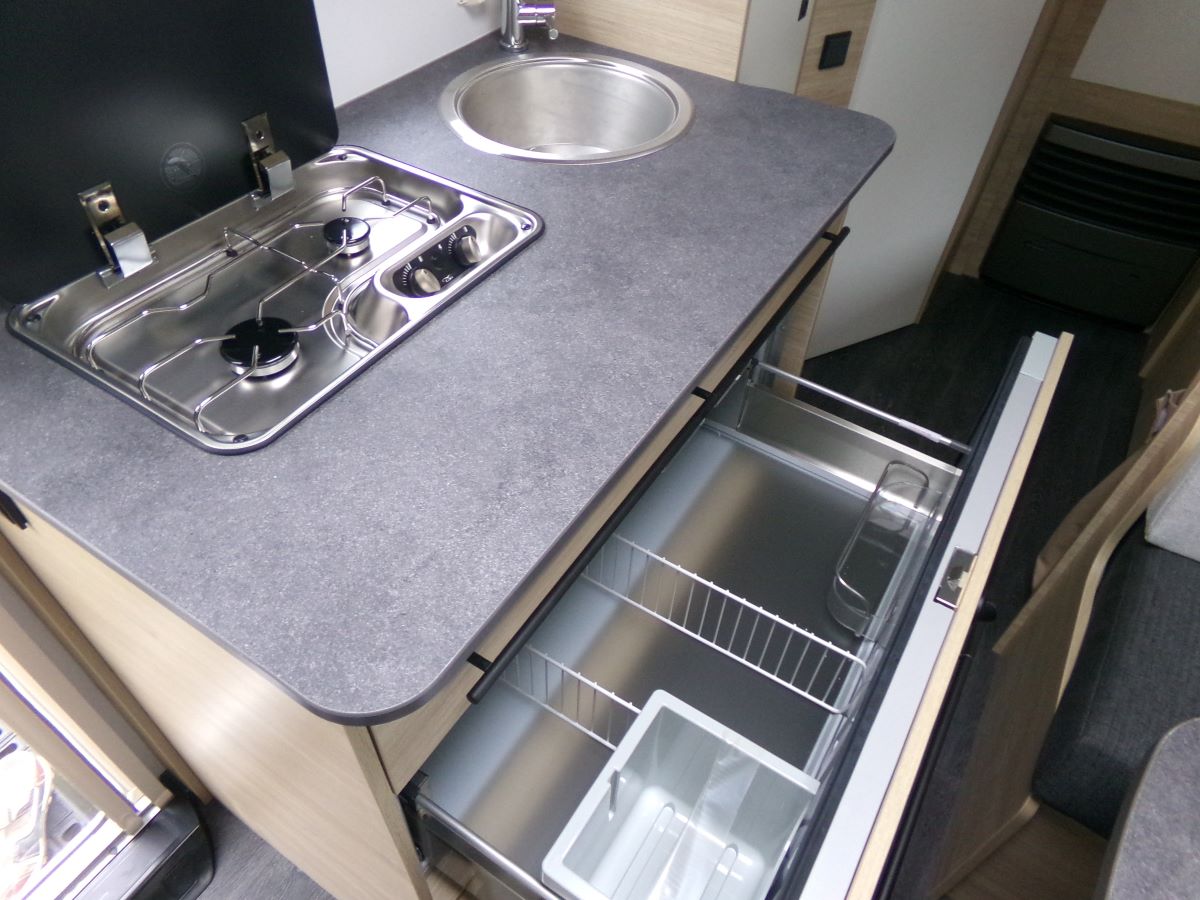 GFK Polyester Dach und Wände, Ausstellfenster mit Kombirollos, 2 flammen Gaskochherd Kühlschrank XL-Freeze 150 l,