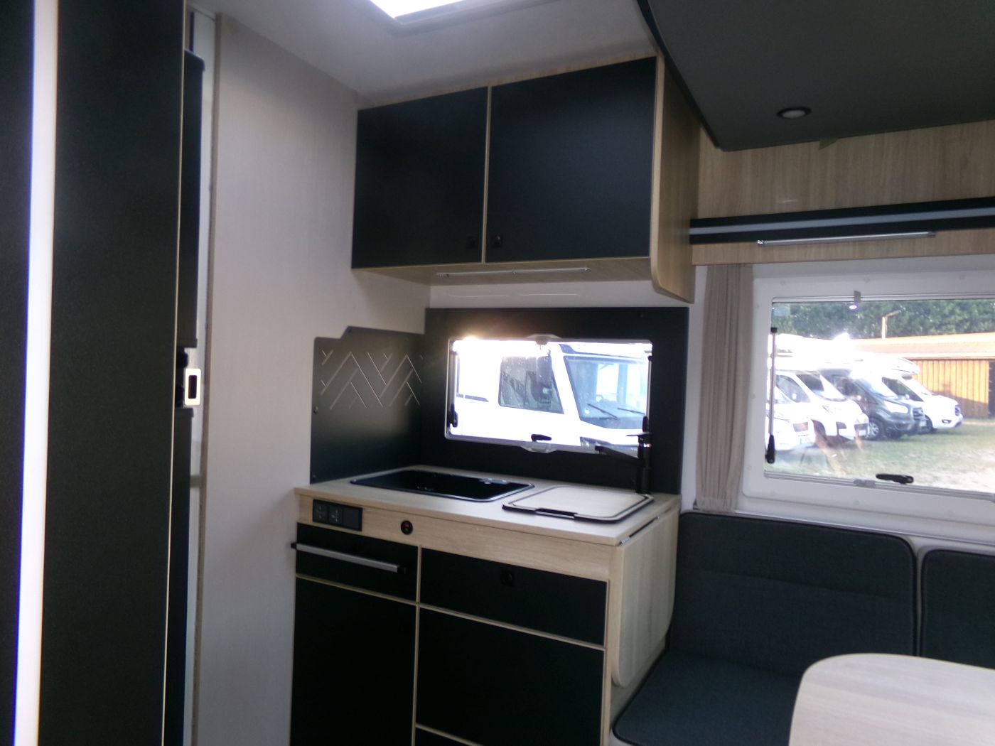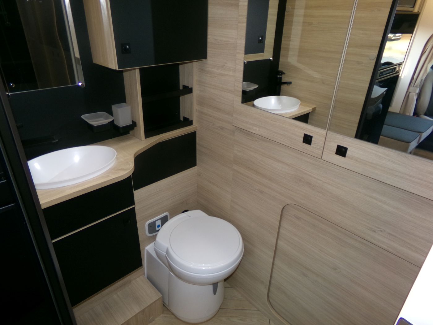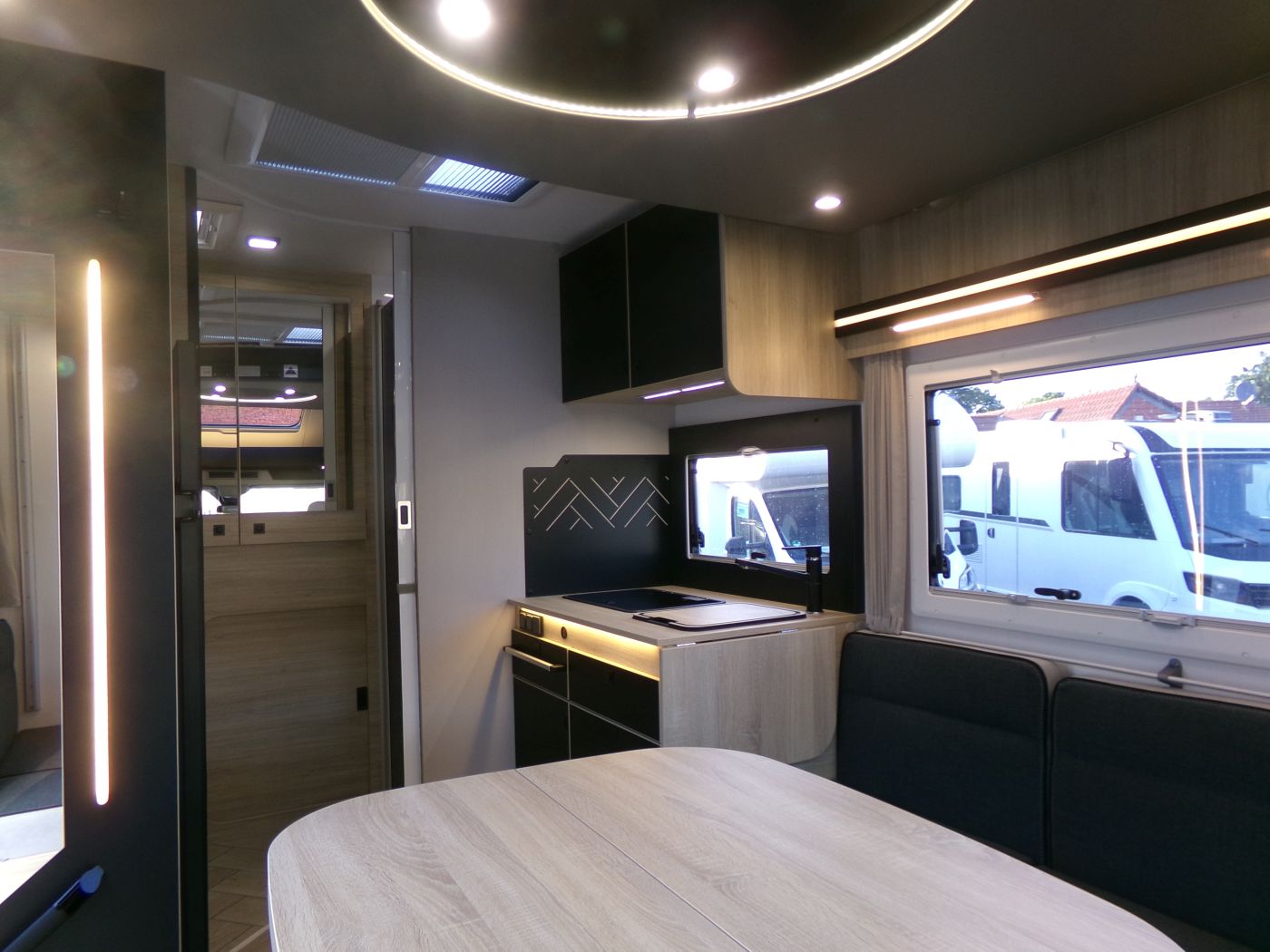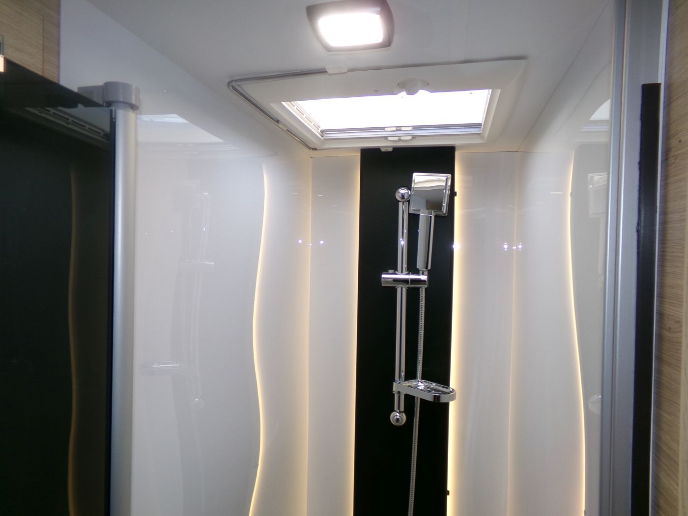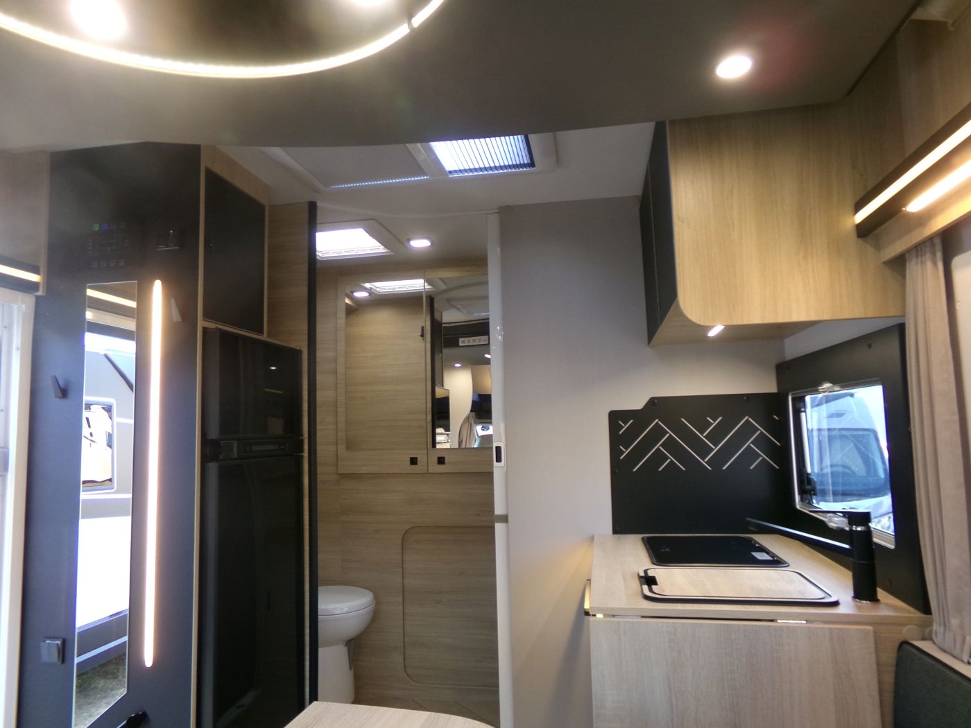 GFK Polyester Dach-Wände und Boden, LED Aussenleuchte, Ausstellfenster mit Kombirollos, Luxus Aufbautür, großer Kühlschrank 167 l AES, Gaskochherd, Thetford Toilette, separate Dusche
