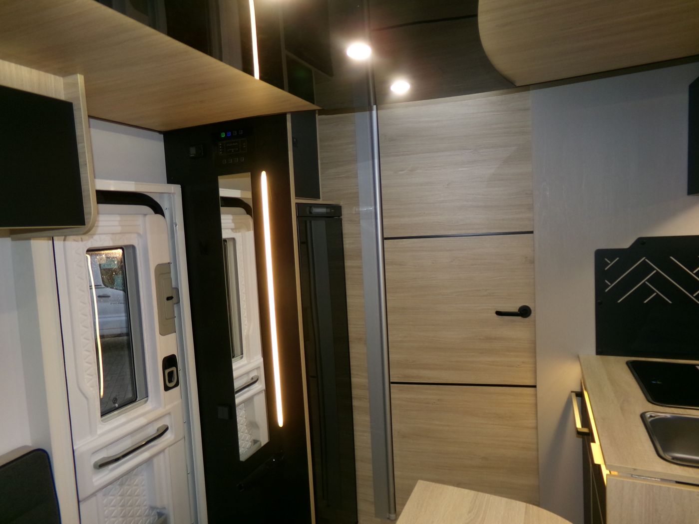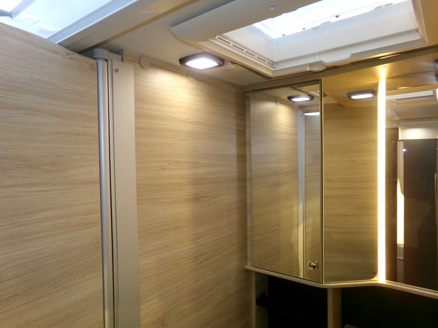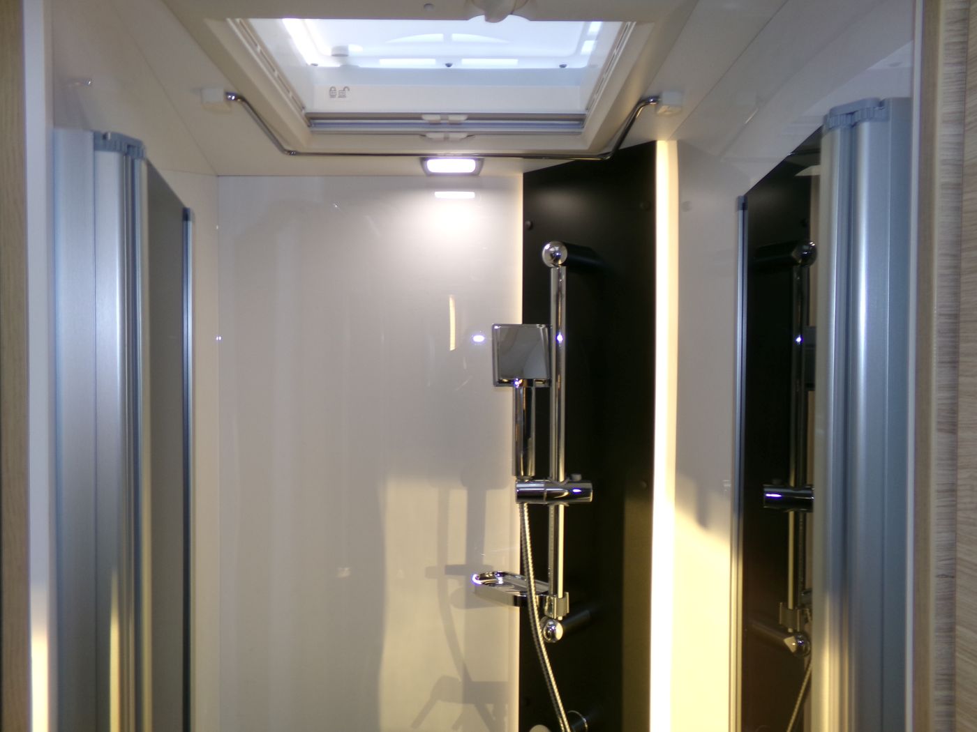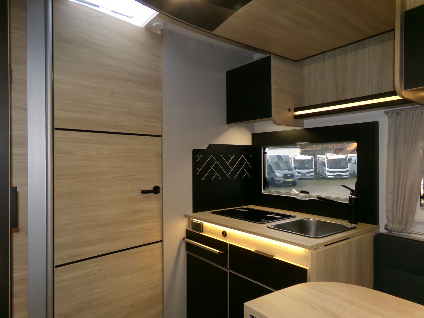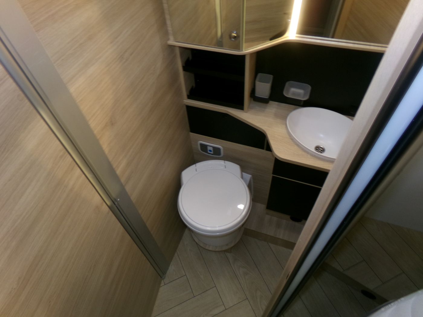 GFK Polyester Dach-Wände und Boden, LED Aussenleuchte, Ausstellfenster mit Kombirollos, Luxus Aufbautür, großer Kühlschrank 141 l AES, Gaskochherd, Thetford Toilette, separate Dusche