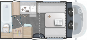 Ausstellfenster mit Kombirollos, Gaskochherd, WW-Boiler, elektr. Thetford Toilette, elekt. Hubbett und Tisch, Komfort-Matratze, Gas- Aussensteckdose, Anschluss- Aussendusche, LED Aussenleuchte,